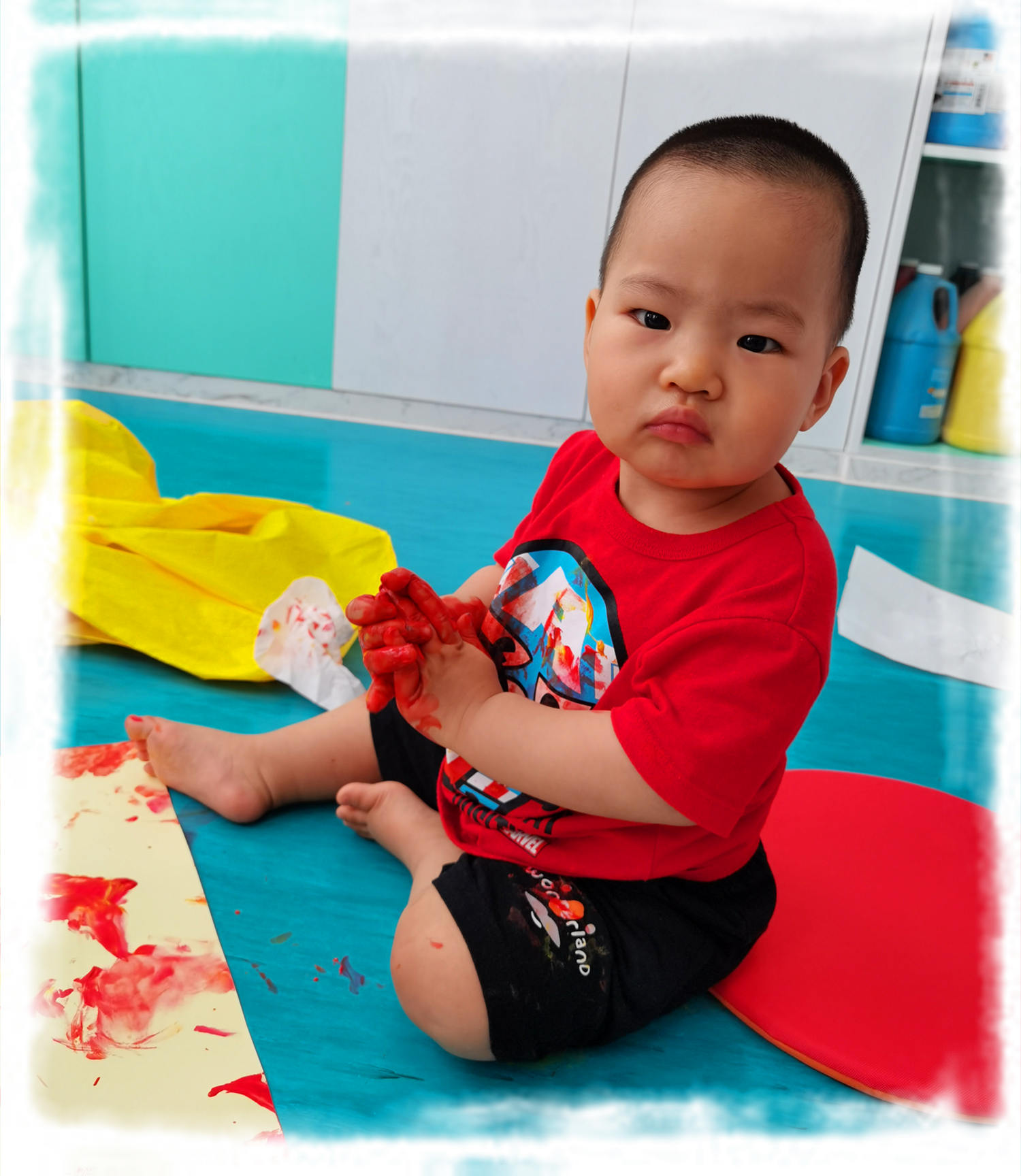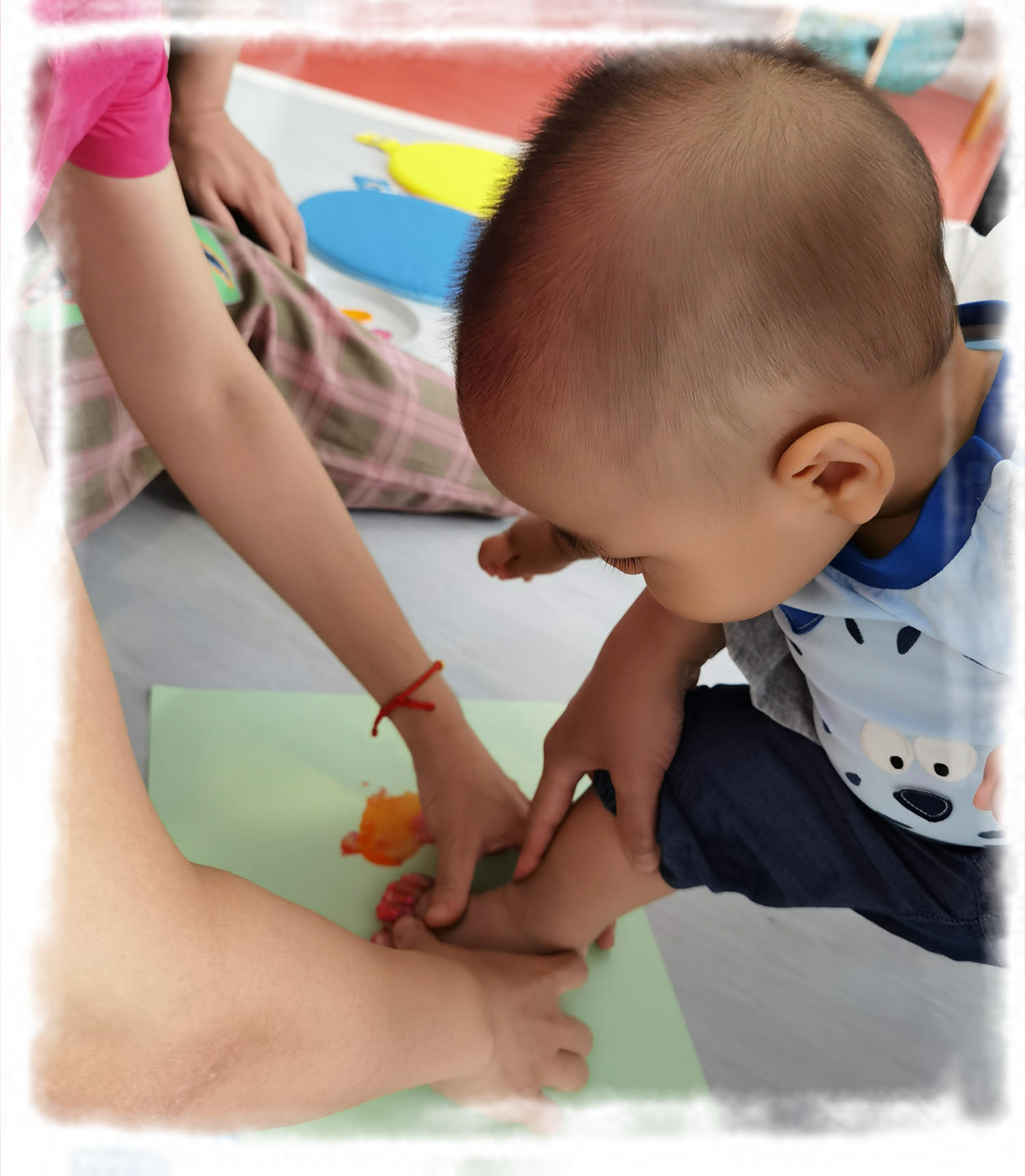 随后老师们带领家庭们来到STEAM教室,活动的其中一个环节就是带宝宝们拓印五彩手印和脚印,让我们一起来记录宝宝们的成长轨迹!